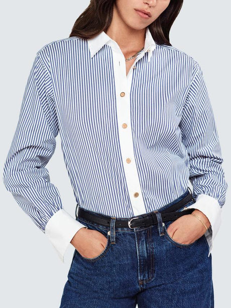 Frame The Borrowed Womens Cotton Blend Stripe Shirt - Blue/White - Size L
