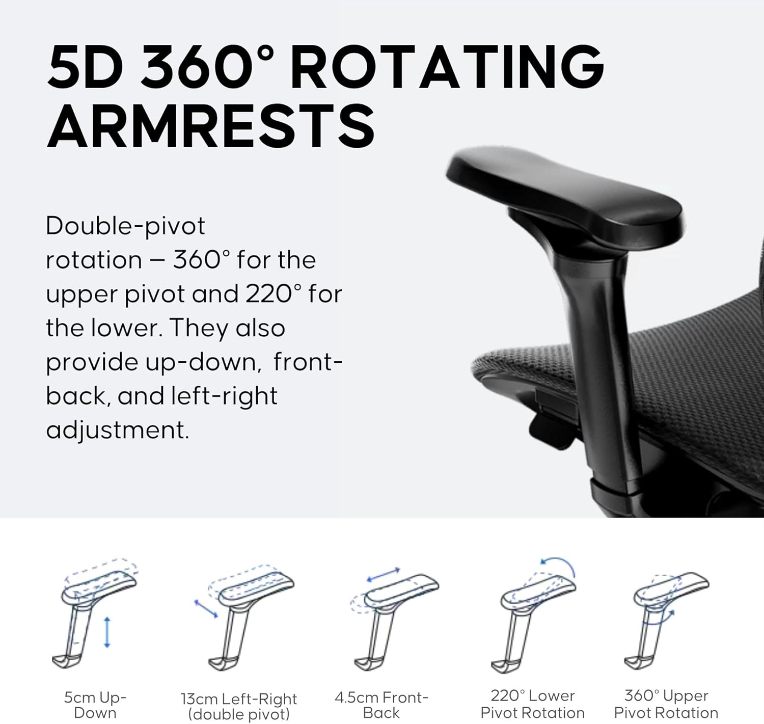 5D Rotating Armrests: Fully adjustable 5D armrests offer 360° rotation, height, depth, and angle customisation. This ergonomic feature makes it a top pick for video game chairs, pc chairs for adults, and even professional setups