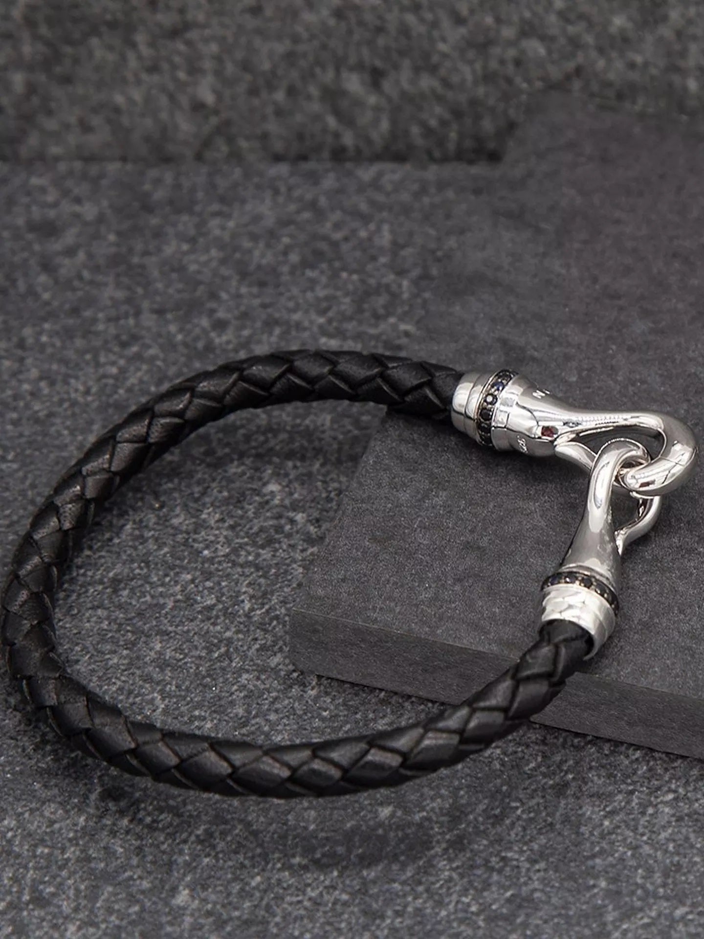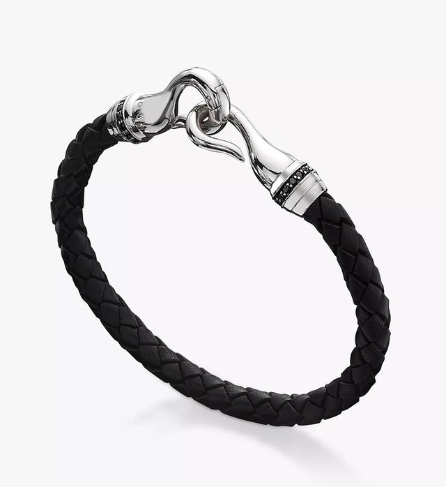 Upgrade your look with this leather bracelet from Hoxton London. Displaying quality craftsmanship, it is made from braided leather and closed with a sterling silver hook accentuated with sapphire gemstones.