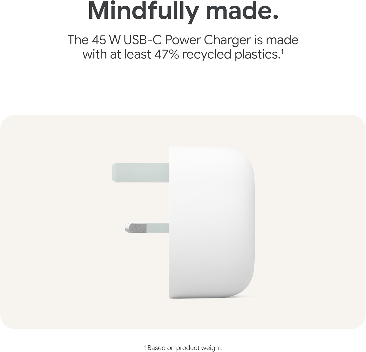 Delivers fast and efficient charging for all of your Pixel devices. Pixel phones, Pixel Buds, the Pixel Tablet and even your laptop – it charges them all. The 45 W USB-C Power Charger is made with at least 47% recycled plastics.