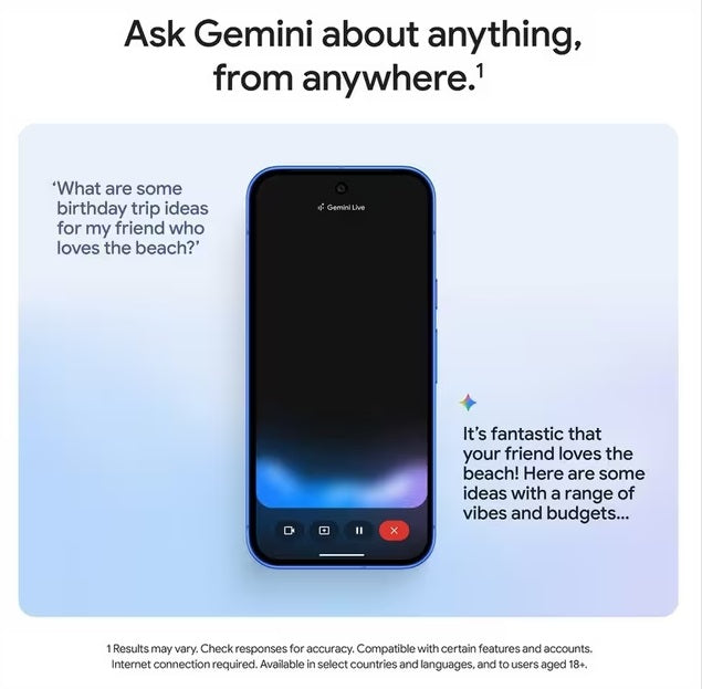 Talk to Gemini about anything you see. Share your camera in Gemini Live conversations to have a live back-and-forth chat with Gemini about what you're seeing. Show your sitting room to get help rearranging it. Show your store cupboard to get dinner ideas using those ingredients. Or show your wardrobe to get styling tips.