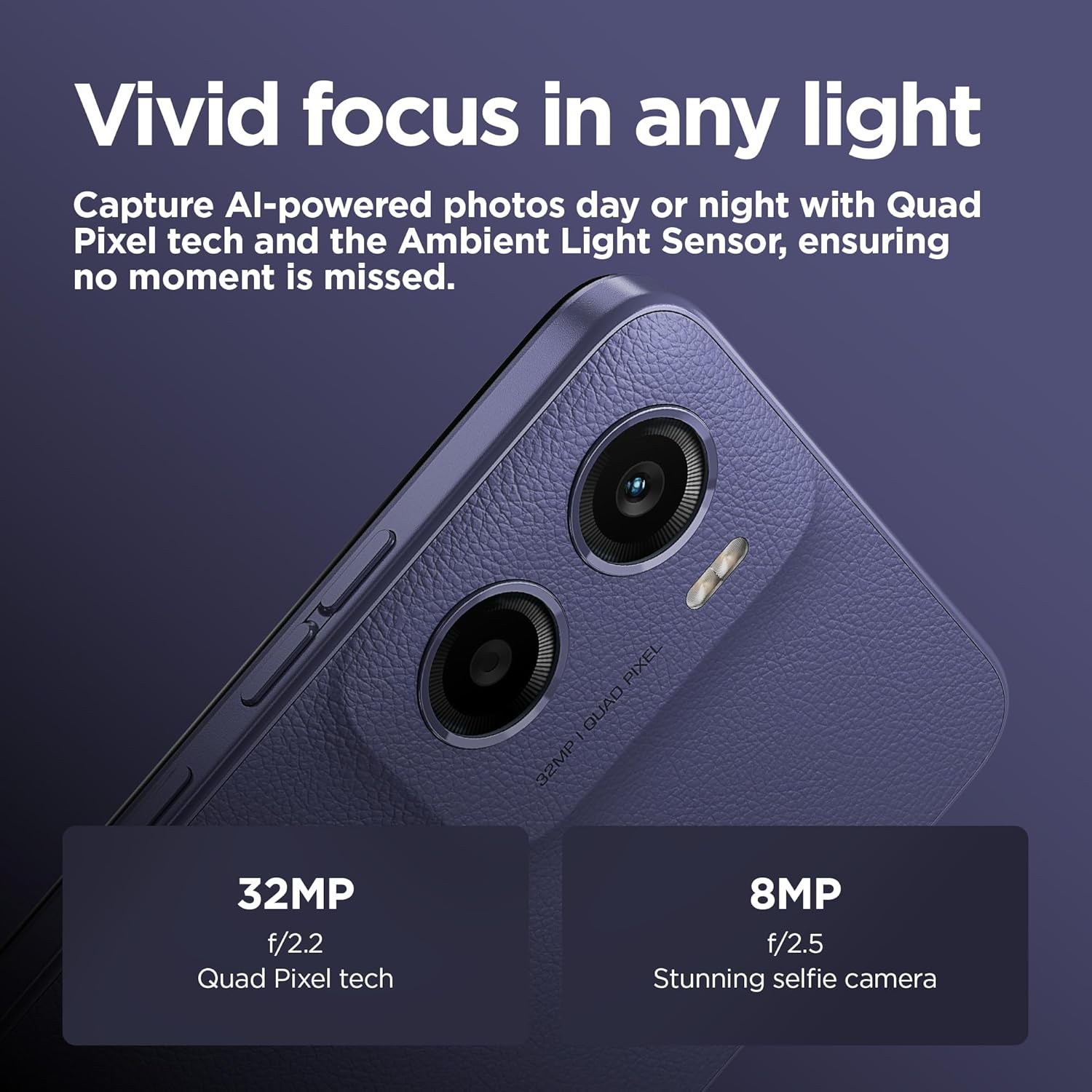 Capture beautifully sharp photos day or night with the AI-powered 32MP Quad Pixel camera. The 32MP sensor combines 4 pixels into 1, for an effective photo resolution of 8MP.