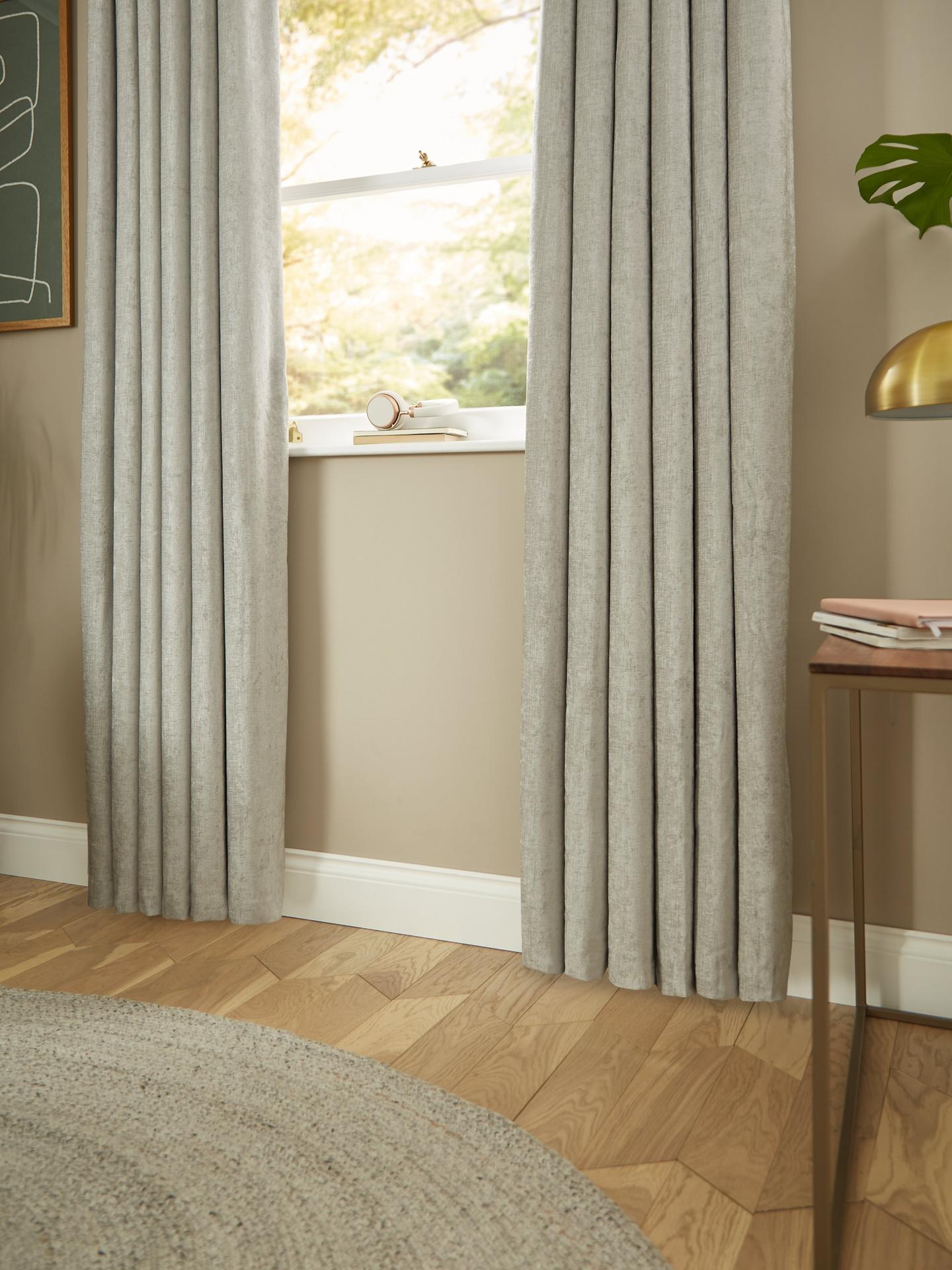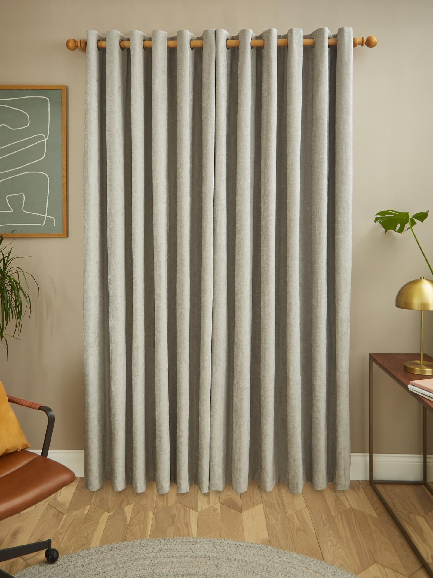 Our plain chenille curtains have an eyelet heading which gives them a contemporary look with large, even folds. The blackout lining eliminates light and lends a full look to the curtain, improving the drape.