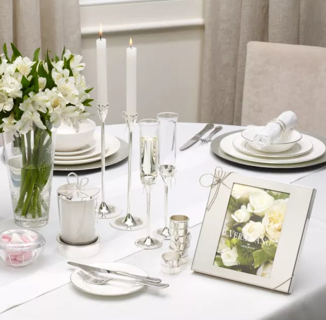 A gorgeous gift, this classic silver-plated photograph frame designed by Vera Wang is decorated with the signature Love Knots twisted ribbon design.