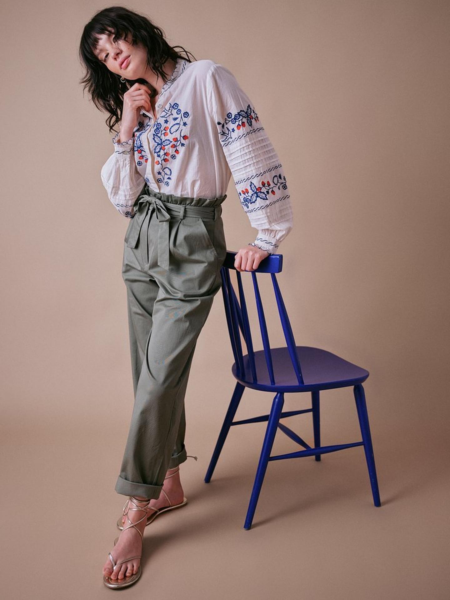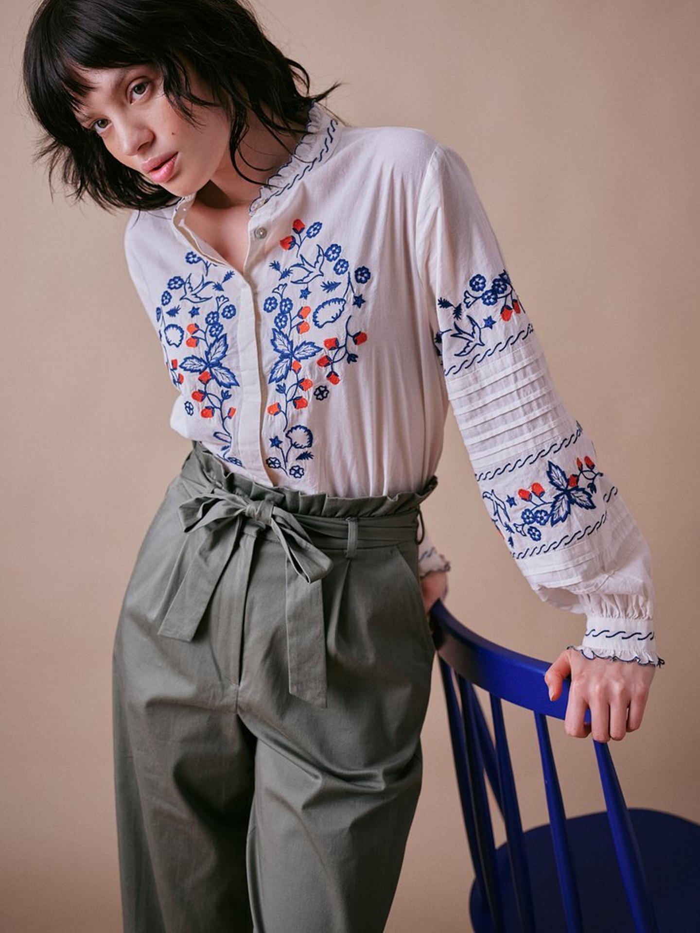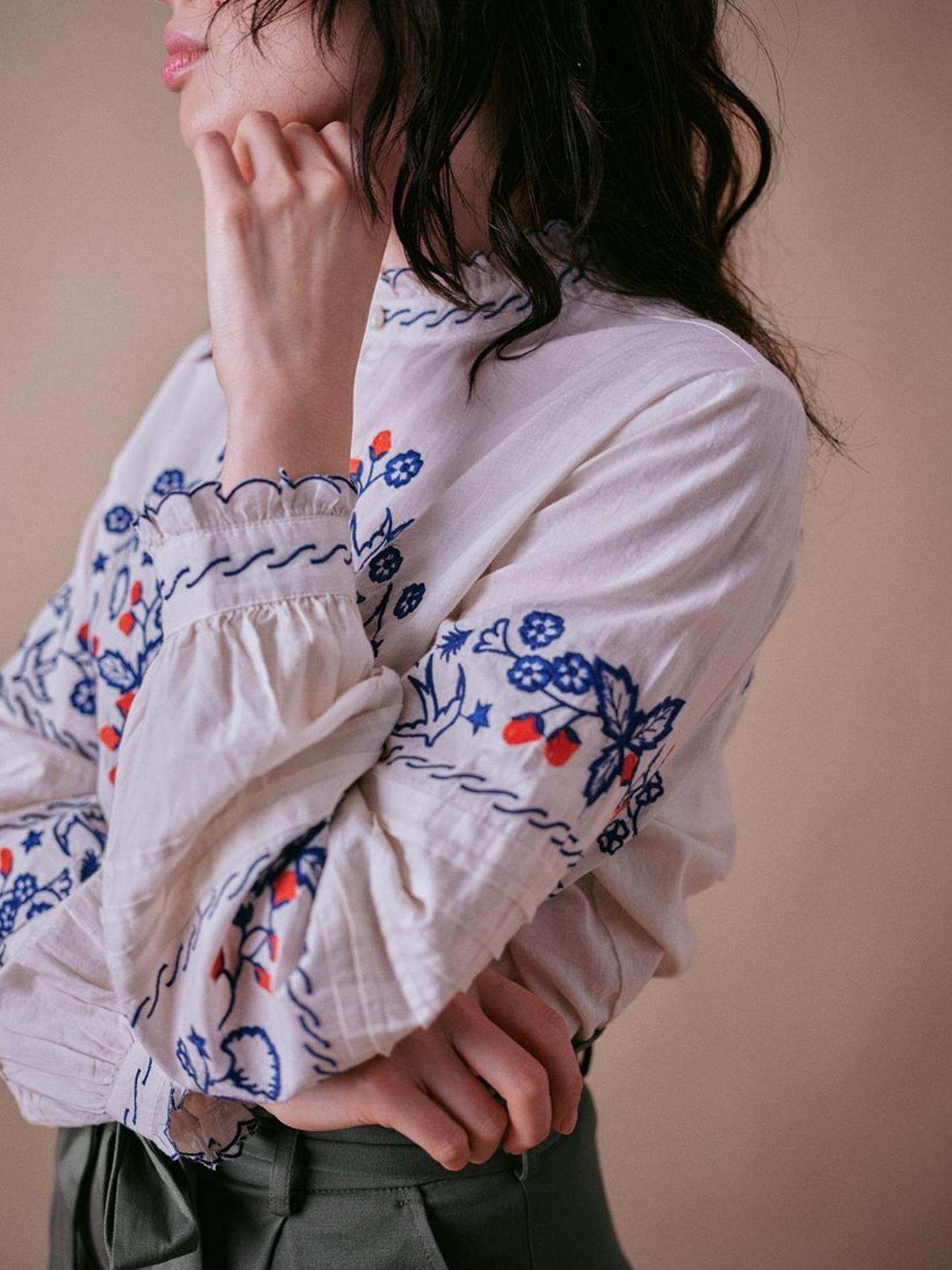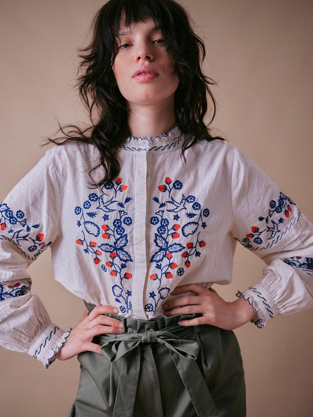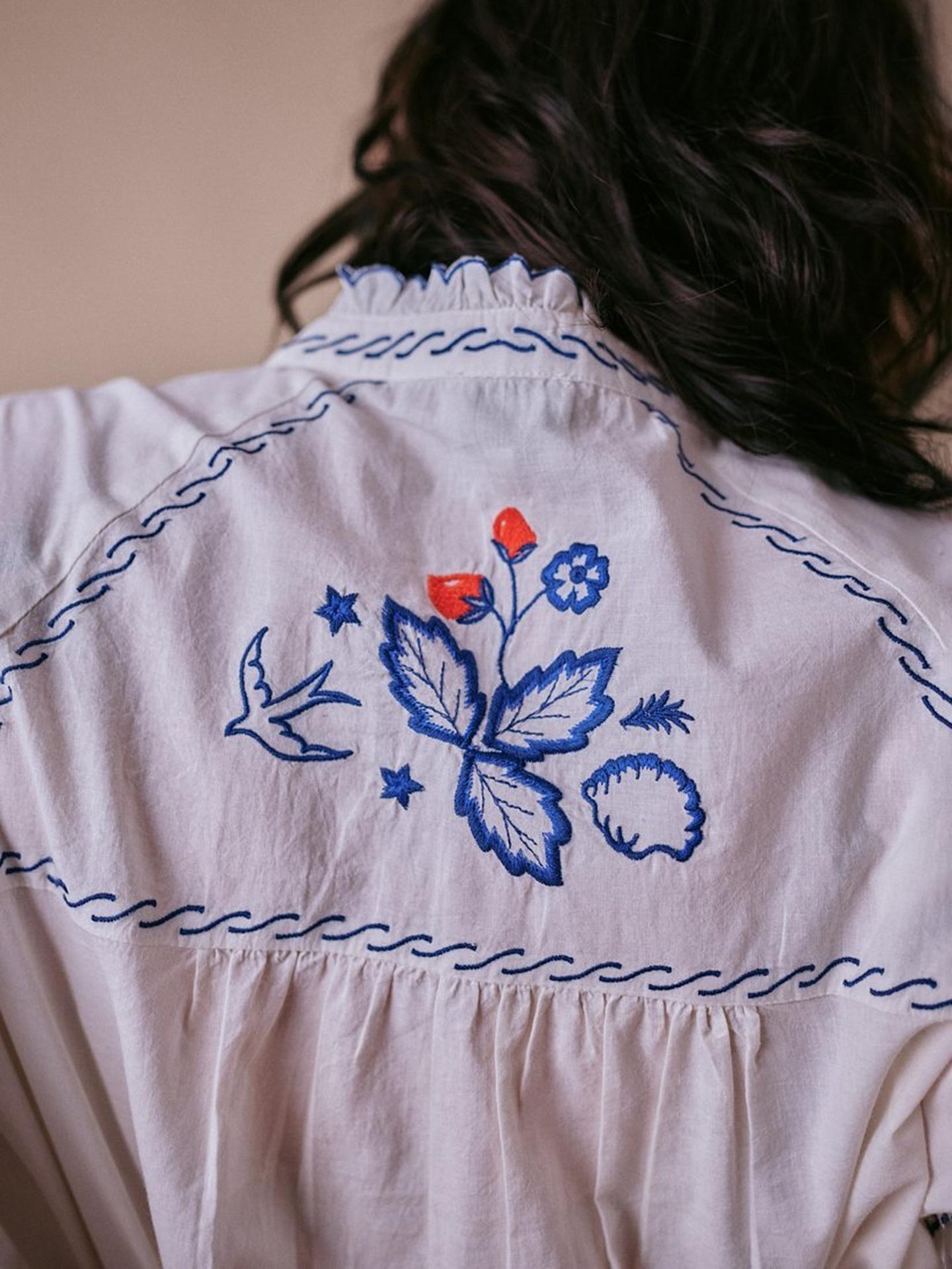 Crafted in the softest lightweight cotton adorned with delicate Wild Strawberries & Cream inspired summer embroideries. The Pin Tucks, ruffles and embroideries work their way around the seams and onto the back of the blouse to soften the silhouette for a feminine finish. Button-through for ease, long sleeves and functional cuff detail.