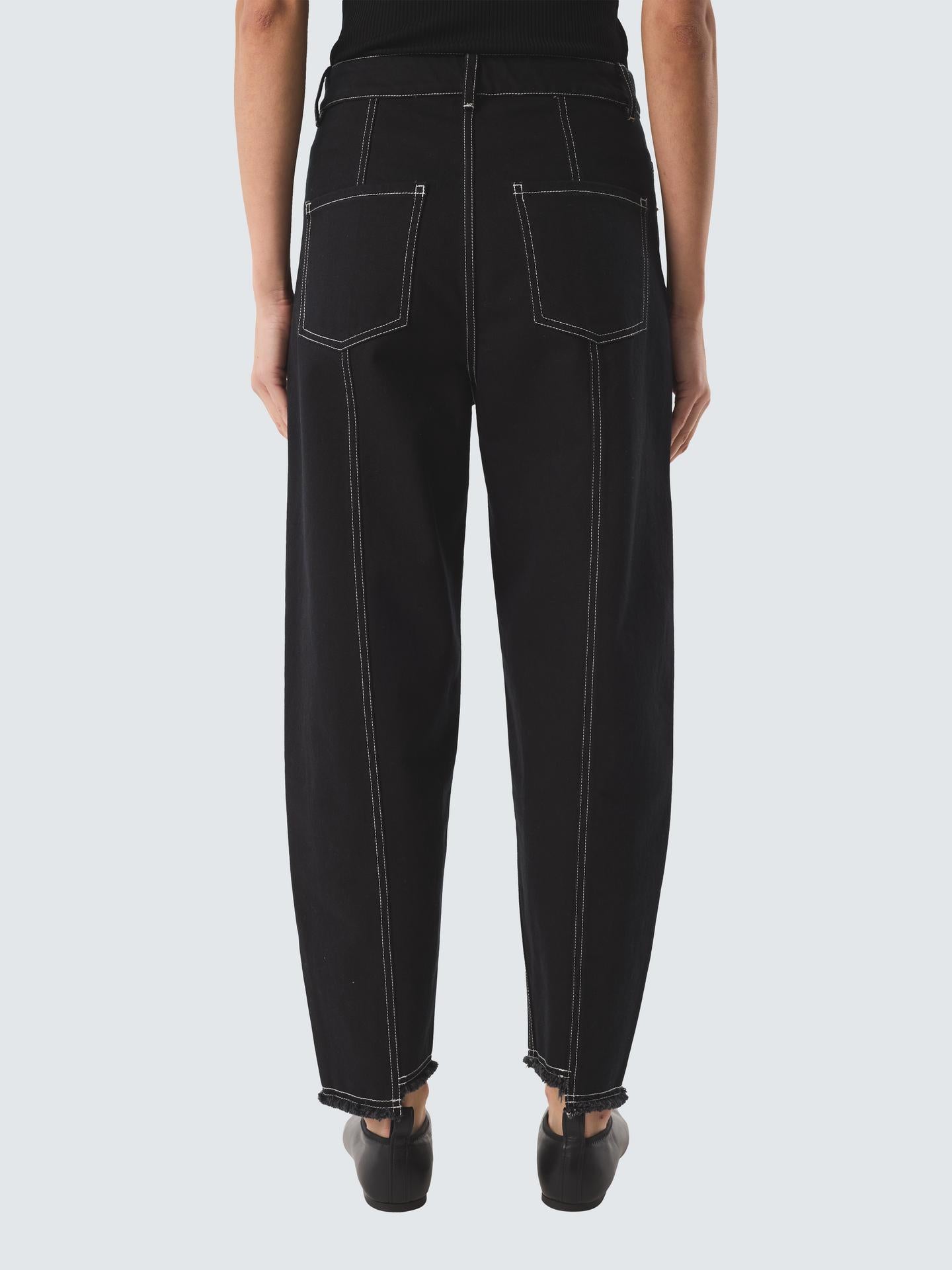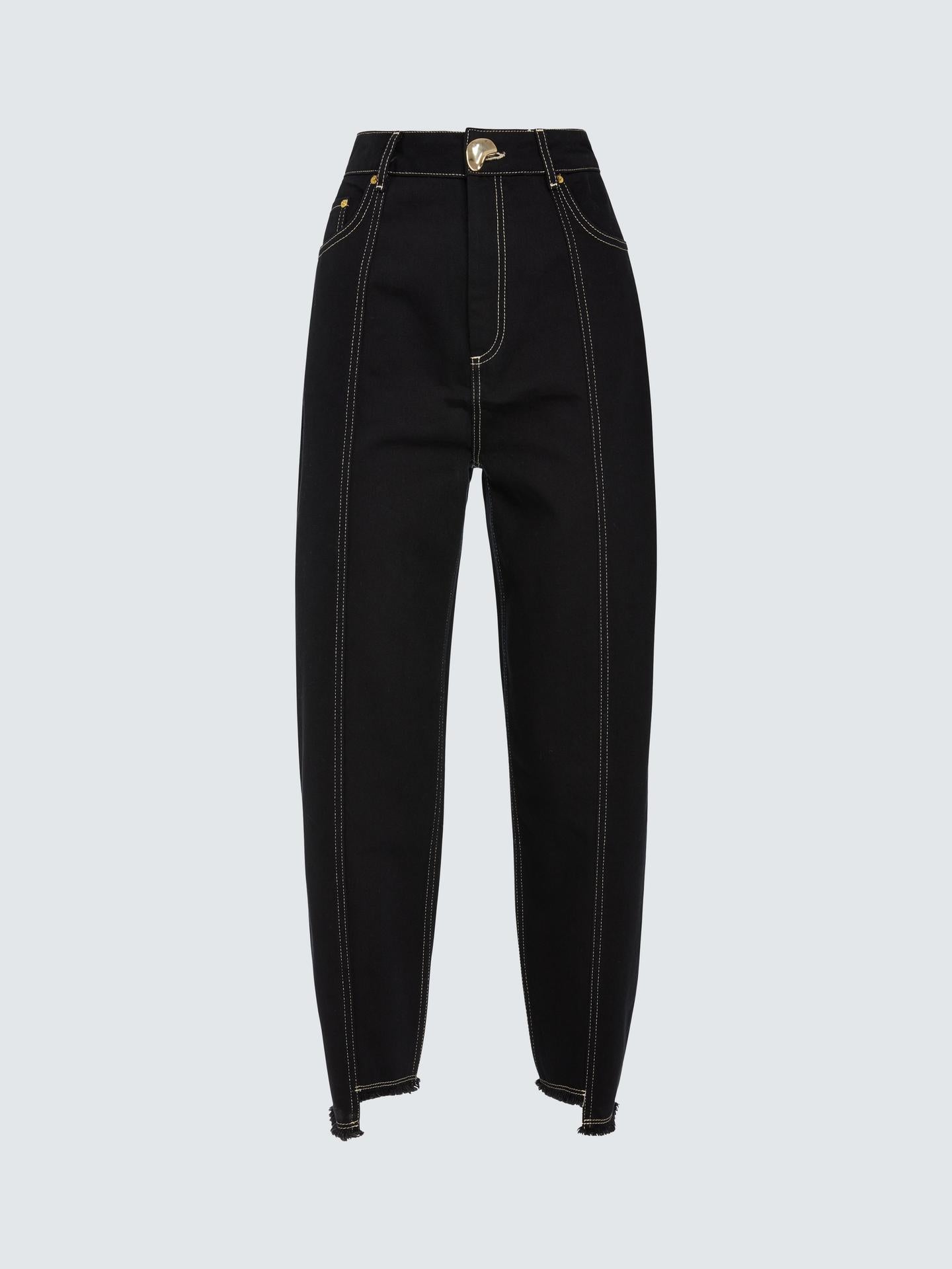 The Sol is cut from 100% cotton with a high-rise waist and a tapered leg that finishes in an asymmetric frayed hem. Finished with distinctive kidney hardware at the fly to bring elevation and distinction to the workwear classic.