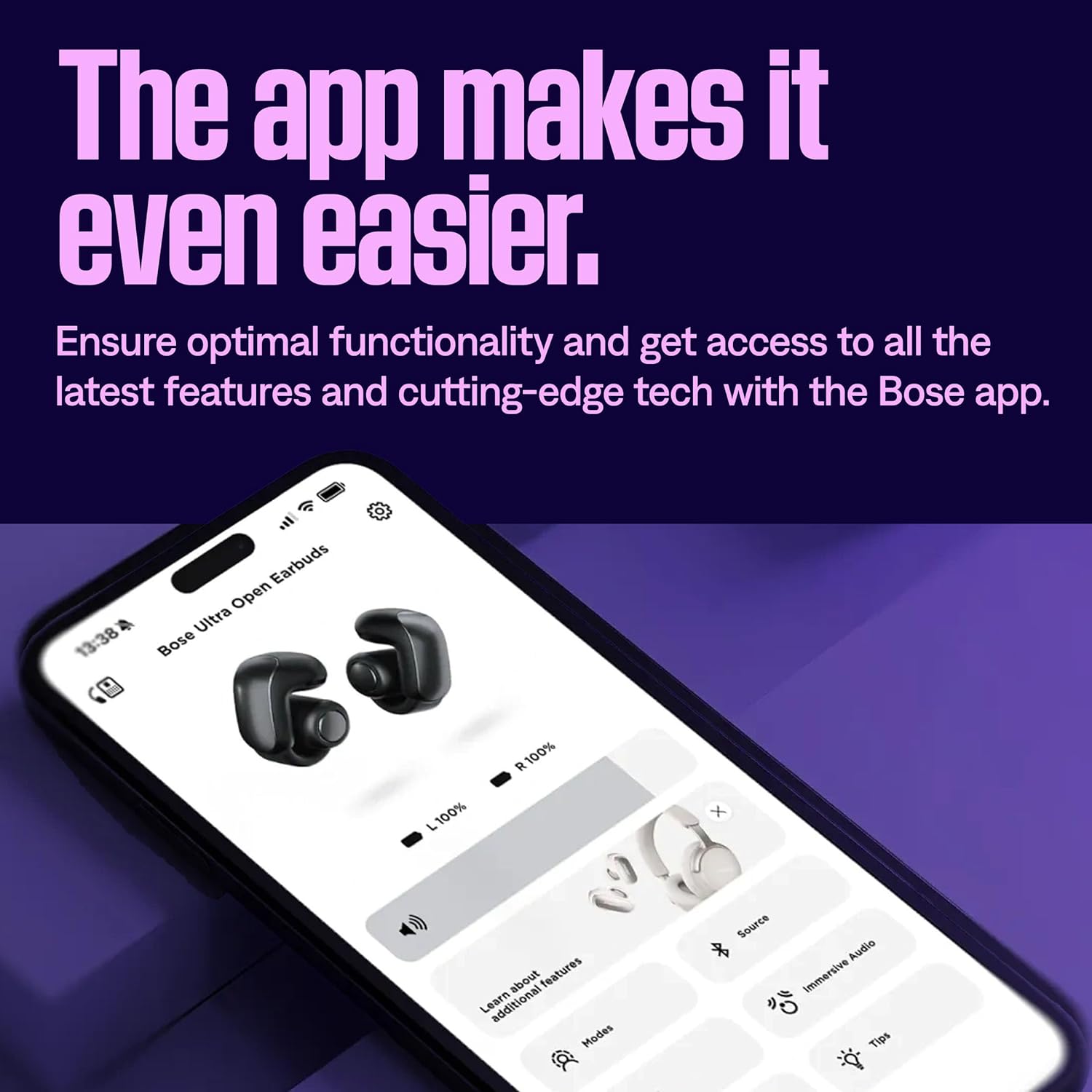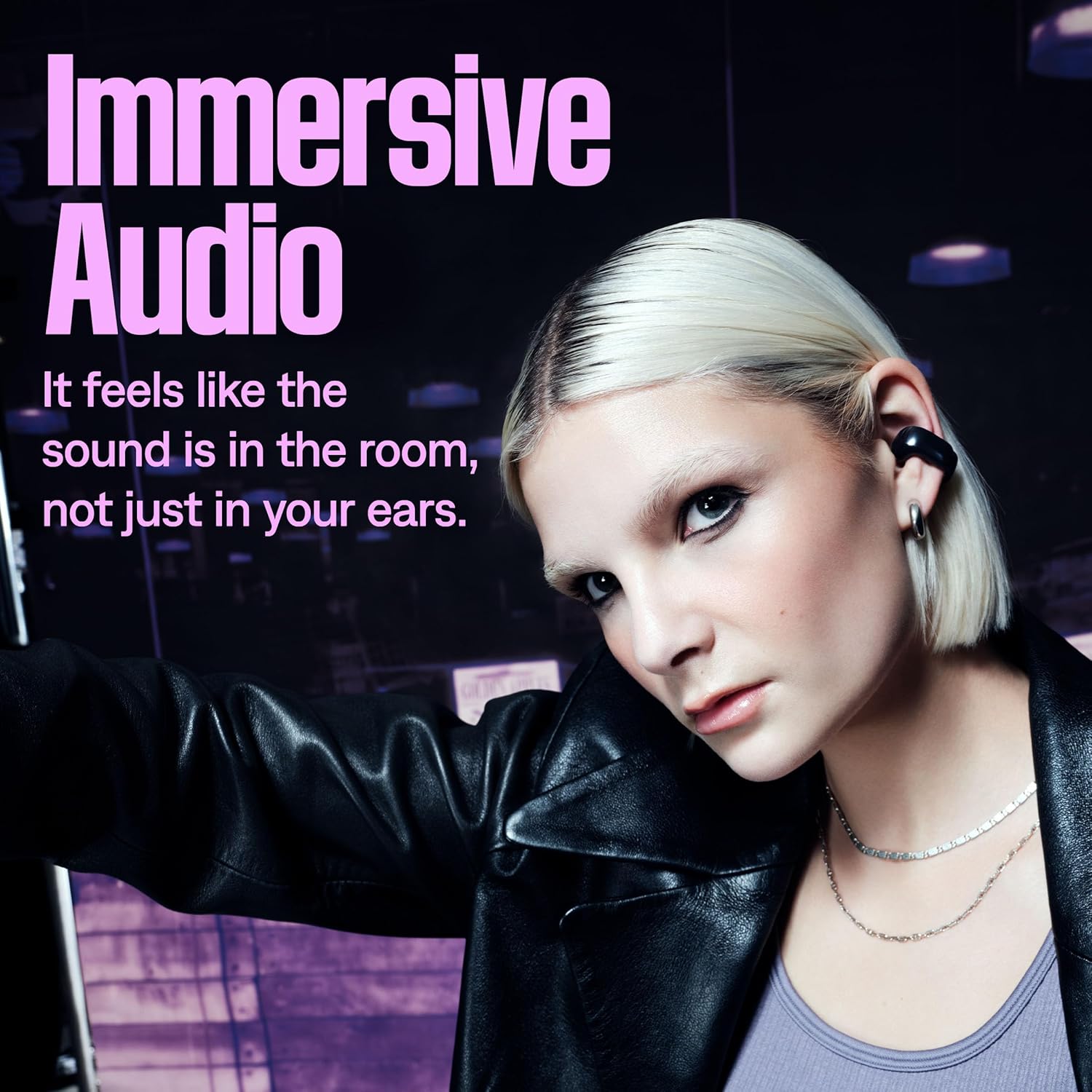 Stay Open to the world. Immerse yourself in immersive Bose quality sound. Yes, you can do both with the Ultra Open Earbuds. Hear what’s going on around you, AND hear your favourite tunes in exceptional audio. With light-as-air grip you might just forget you’re wearing them, surrounded by sound thanks to Bose Immersive Audio tech. And with long battery life thanks to the included charging carry case, you can stay open all day long.