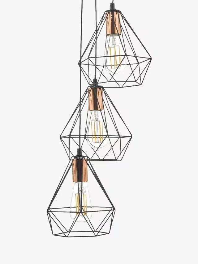 With three pendants suspended in a tiered formation, this ceiling light is a modern option with an industrial edge. Each pendant is made from metal in a geometric style and encases a copper-finished lamp holder. It needs three bulbs in total and is best paired with vintage lamps to achieve the popular, ambient light aesthetic.
