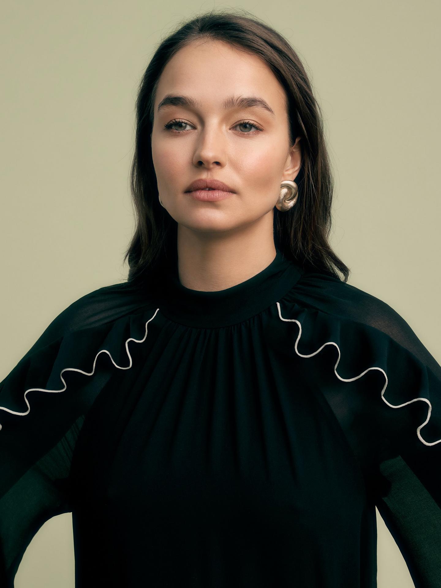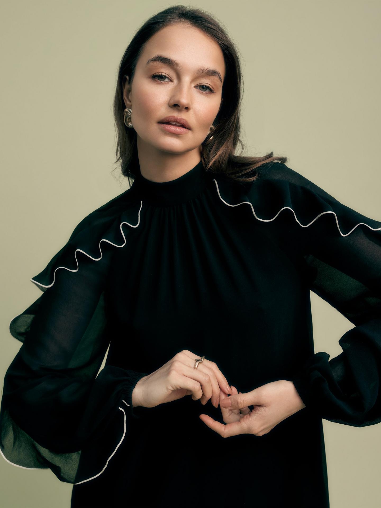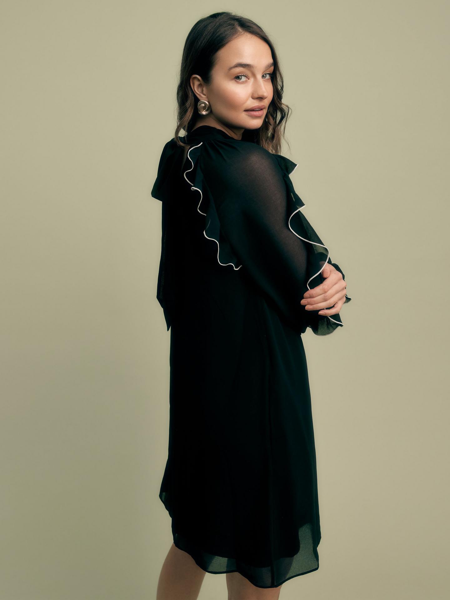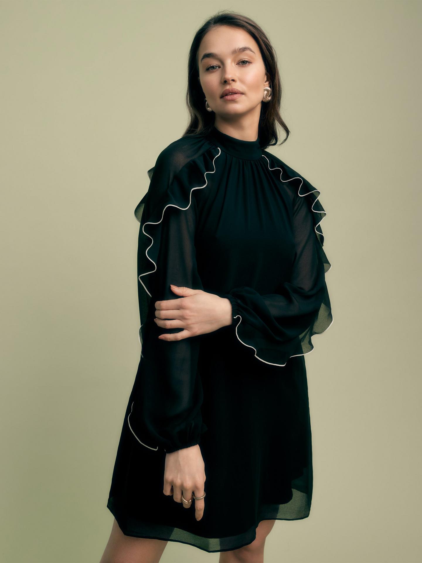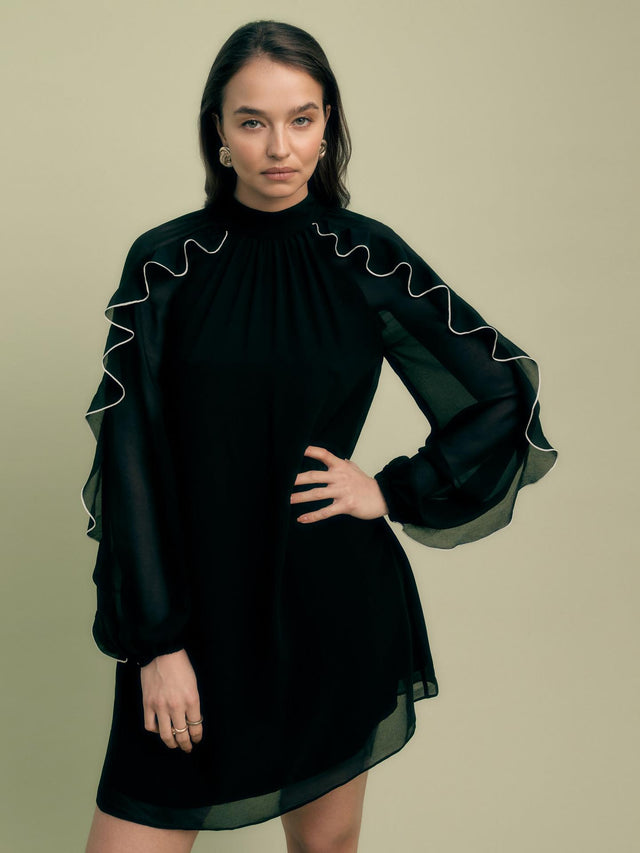 Eye catching ruffles with contrast tipping give this mini dress a modern twist - versatile for all occasions.