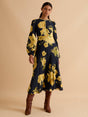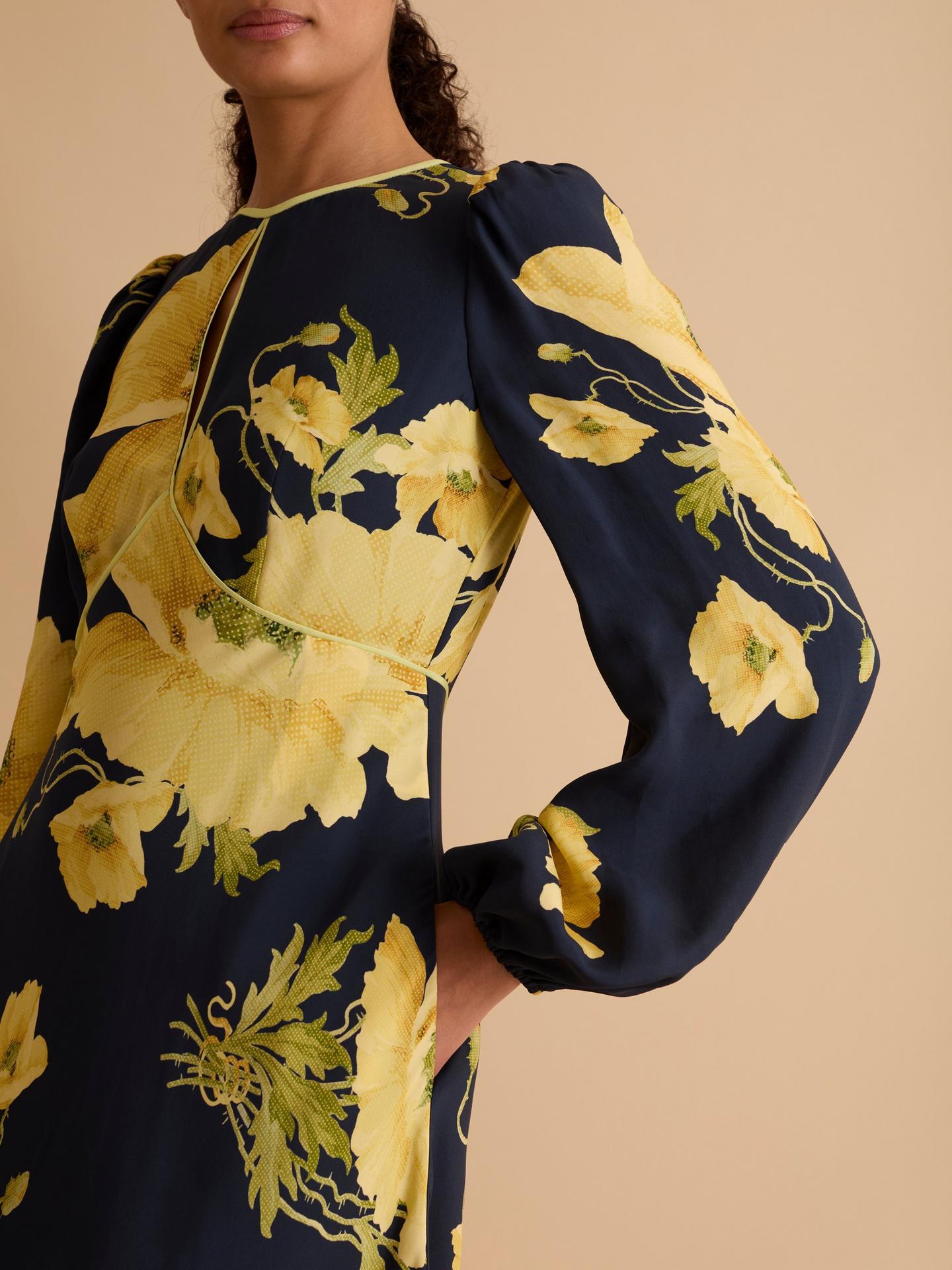 With a long blouson sleeve, keyhole neckline and contrast piping, this bias cut dress is the perfect showcase for a new season floral print.