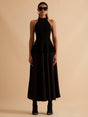A real showstopper, this dress combines a knitted halterneck bodice, a peplum hem and engineered rib detailing, with a fluid satin skirt.