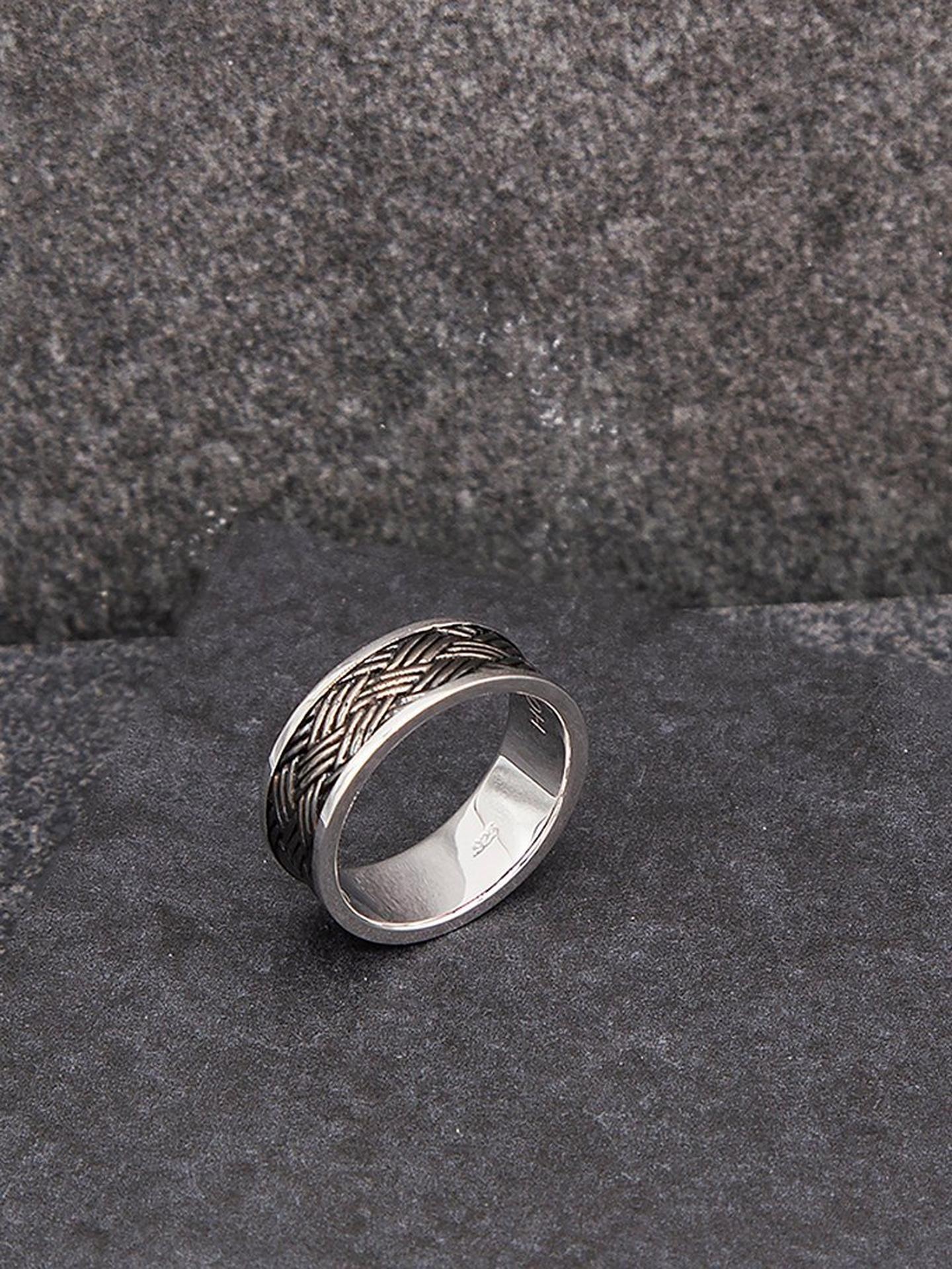 Made from sterling silver this ring is designed with oxidised detailing in a bamboo inspired pattern.
