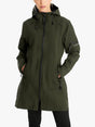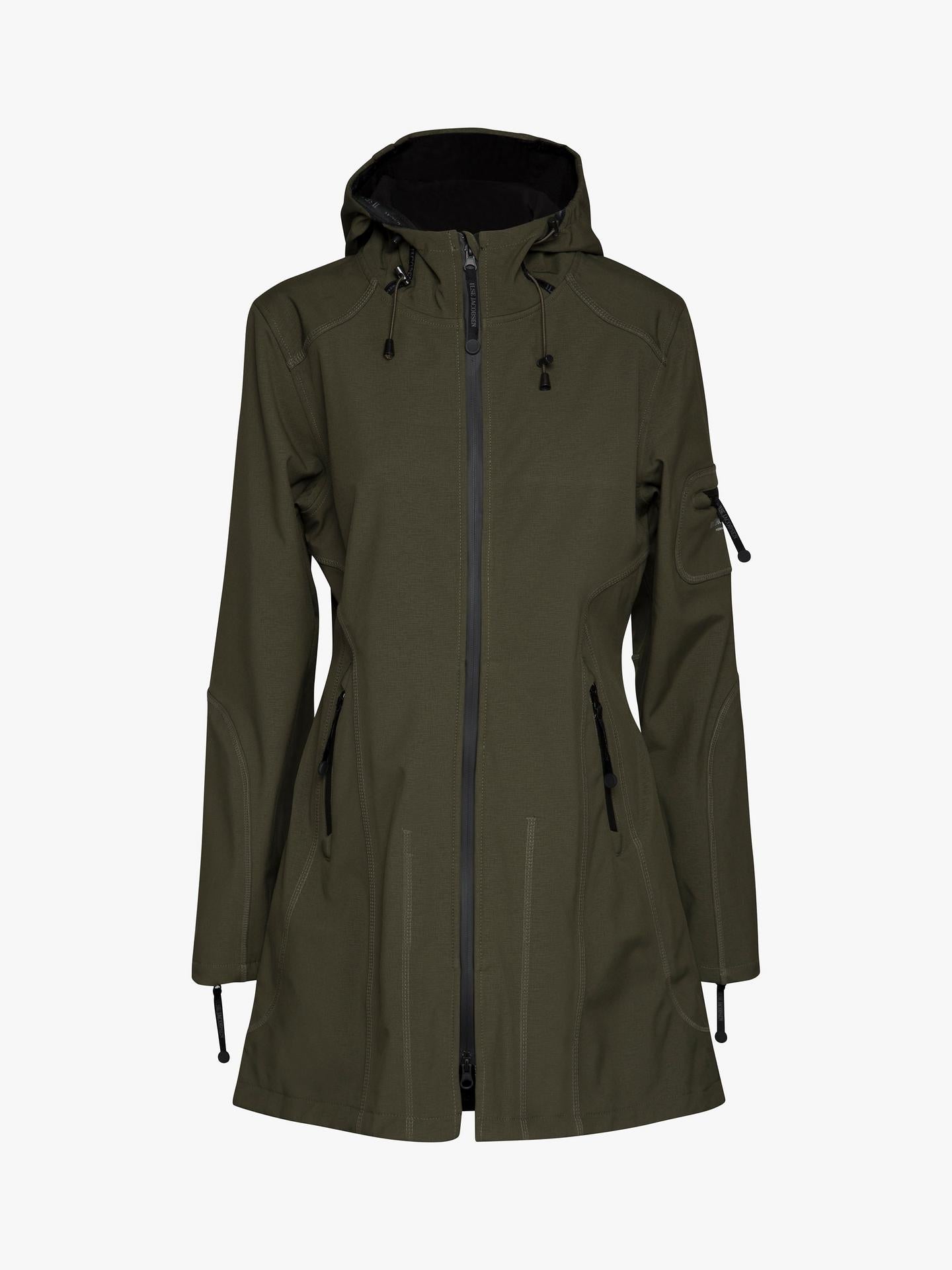 This functional raincoat, made of breathable and stretchable soft shell material, really emphasises the feminine silhouette with its cutlines and the rich double folded pleat at back for freedom of movement. All seams are taped.