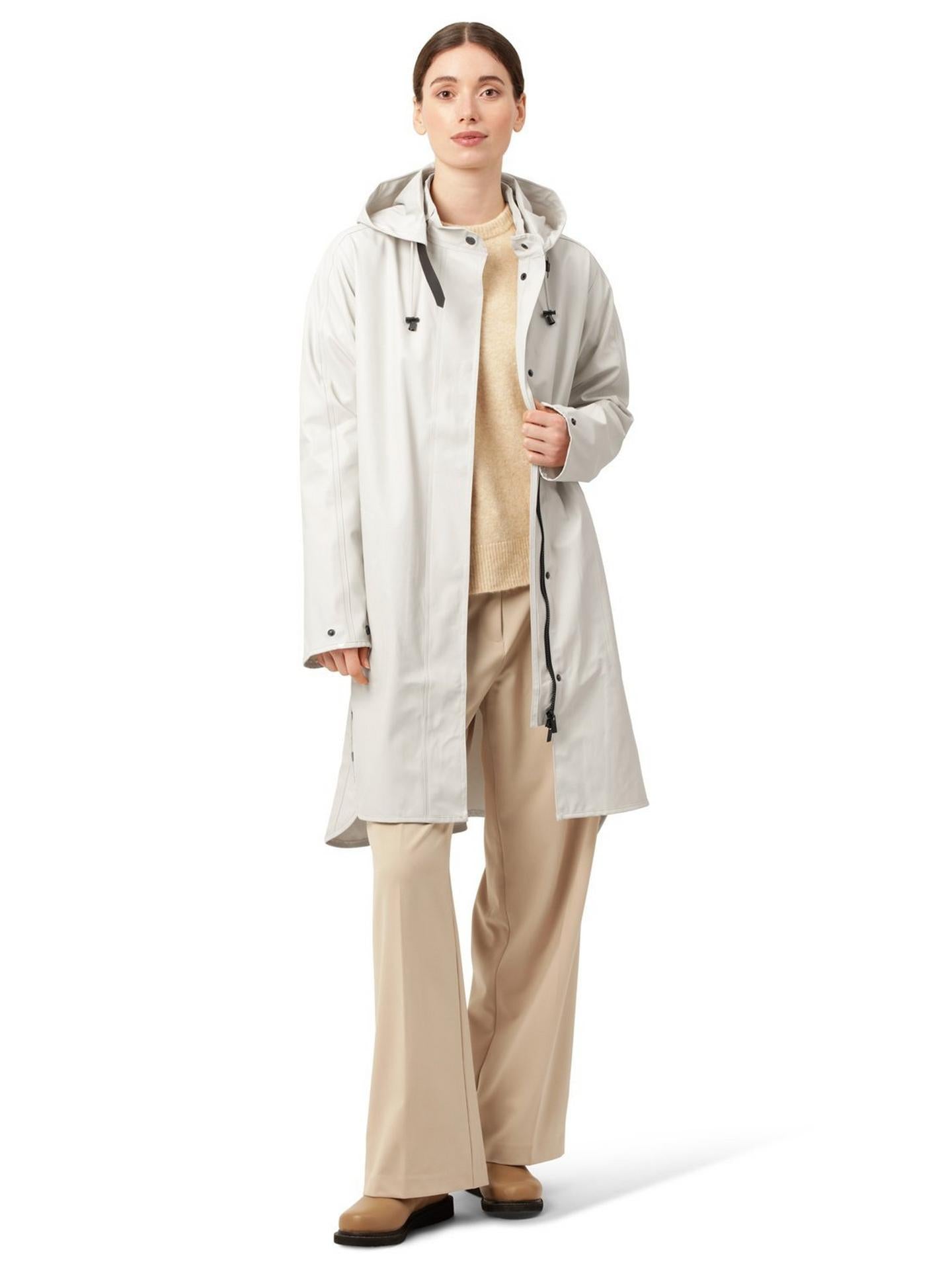 This trench coat from Ilse Jacobsen Hornbæk comes in a flattering longer length and loose fit. A practical option in changeable weather with a detachable hood, it is made from a light and subtle waterproof rubberized PU fabric with polyester tricot on the back double welded seams to keep you dry. Inside the style has a clean and delicate finish with logo ribbon.