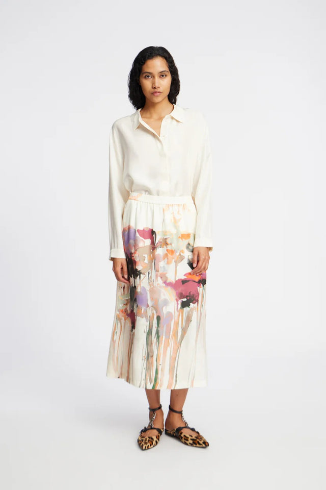 A beautiful skirt made of 100% silk, with an elegant art print. This skirt is designed with an elastic waist and elegant side pockets.