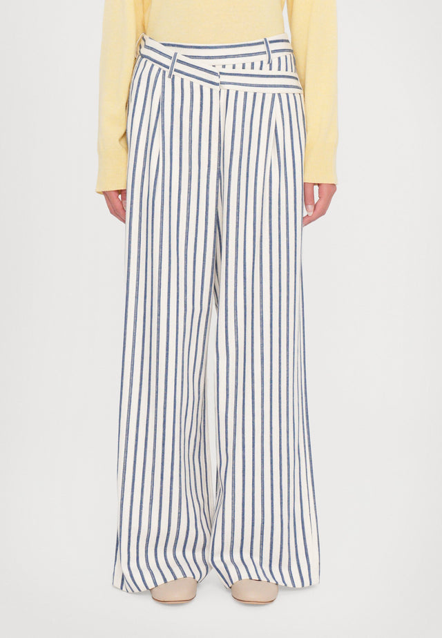 Beautiful striped trousers with an elegant double waistband twist. The trousers are designed with pockets and loose, wide legs.