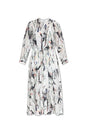Set against a pristine white canvas, the dress is adorned with an abstract, painterly motif in soft shades of green, blue, pink, salmon, and black, evoking the essence of a refined, wearable artwork. Munthe, a celebrated Danish house founded in Copenhagen in 1994, is revered for seamlessly blending exquisite materials, impeccable tailoring, and artistic sensibility with a commitment to responsible production methods.