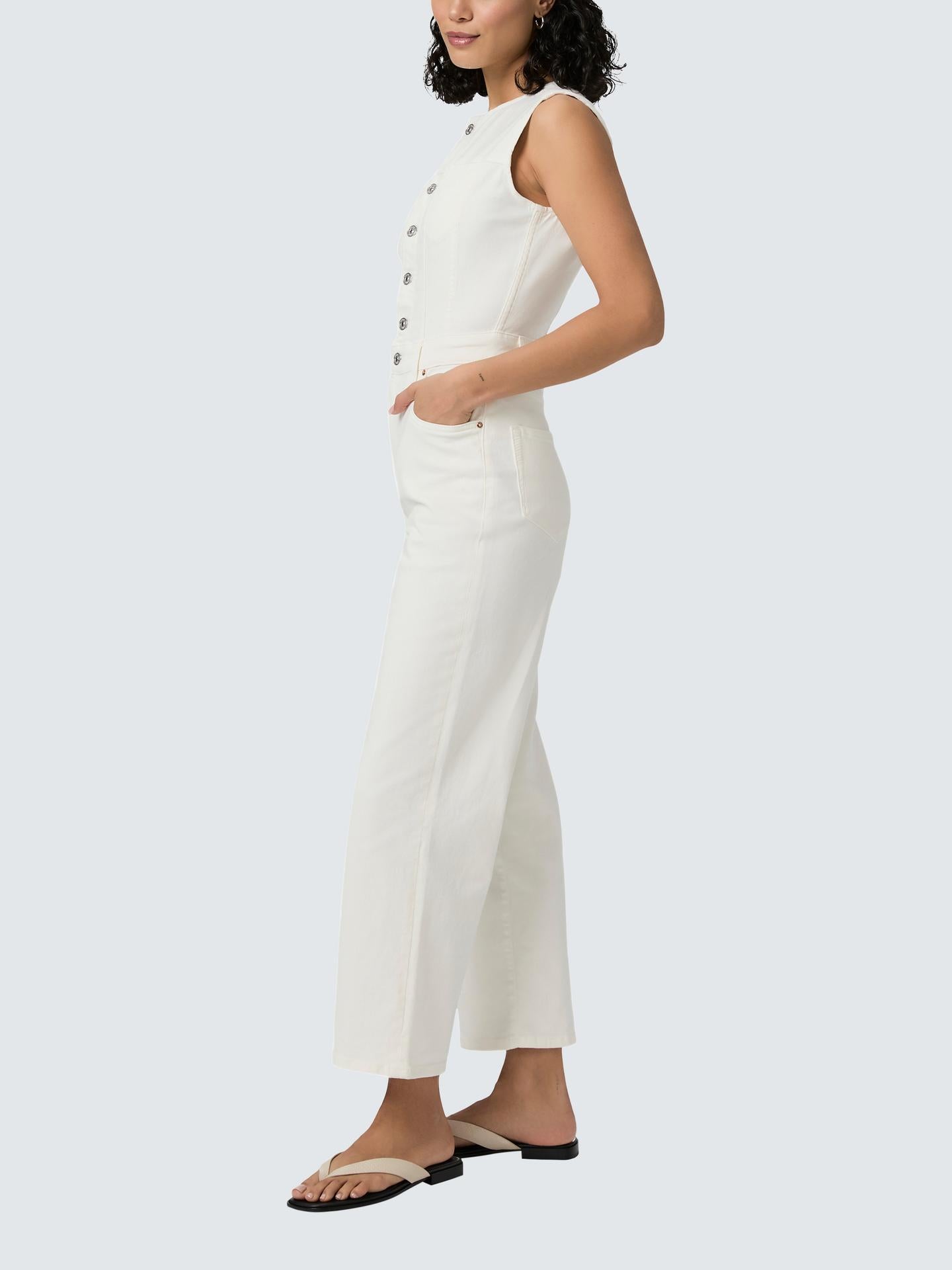 The must-have one-piece of the season. This sleeveless ankle-length jumpsuit is crafted from super soft denim with a hint of stretch for added comfort. Made in tonal Ecru with a slightly relaxed straight leg silhouette, silver front buttons, princess seams, a rounded neckline, and double chest pockets. The Cirie Jumpsuit pairs as easily with heels as it does with trainers and flats.