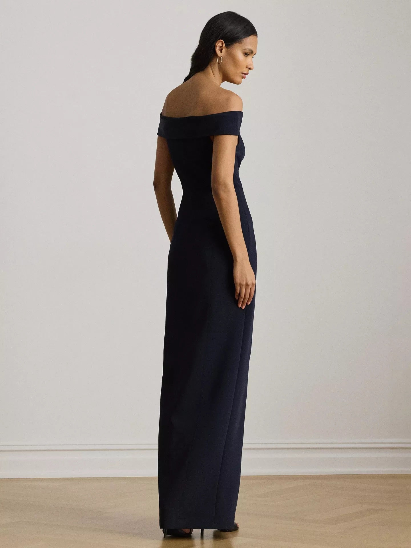 Evoking timeless glamour, this off-the-shoulder gown is designed with thoughtfully placed vertical seams that accentuate its statuesque column silhouette. A slit at the skirt and smooth, stretch-infused crepe afford ease of movement.