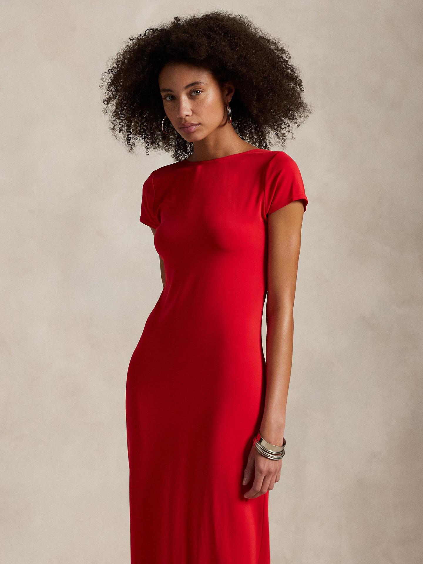 Crafted with fluid, stretch jersey, this short-sleeve dress is defined by a boat neckline with a deep scoopback. Its constructed for a slim fit through the waist and hips with a flared skirt.