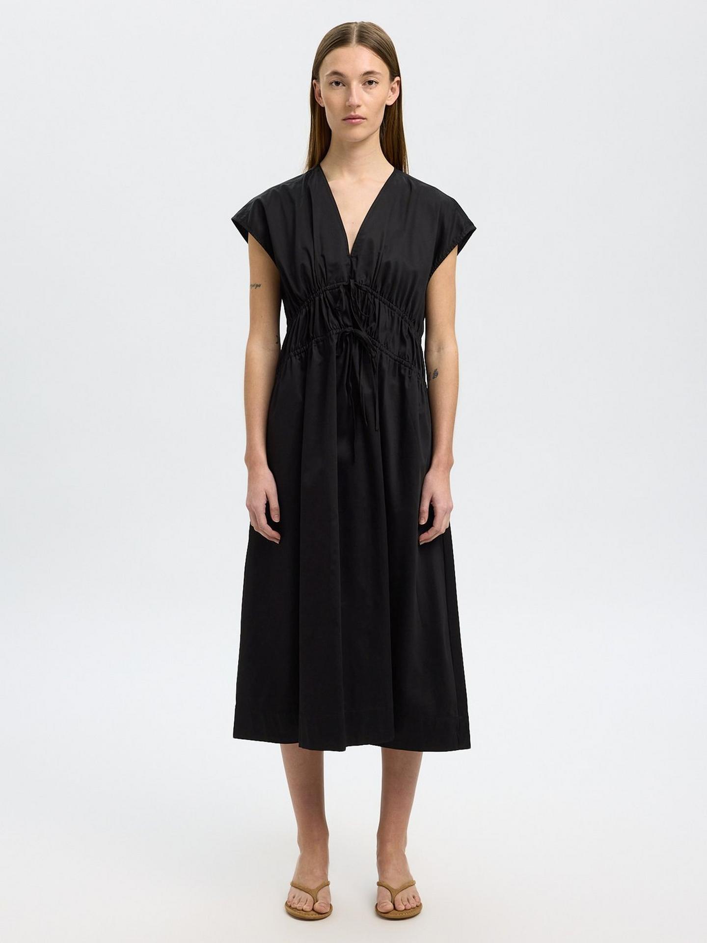 Selected Womens Regular Fit V-Neck Tie Cotton Midi Dress - Size 42 Black