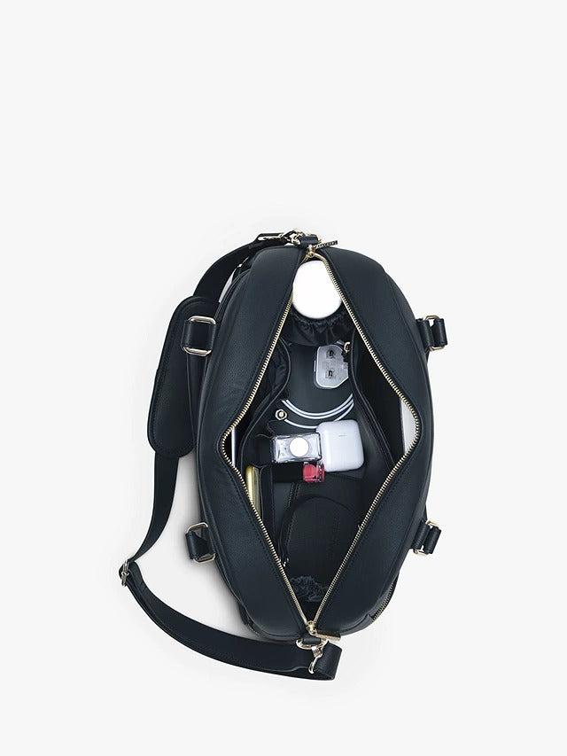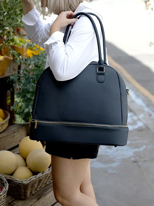 A bag that matches your lifestyle. Add a bit of effortless organisation to your day. This handbag really does have a place for everything, and more, no more losing your phone in a bottomless pit! With a faux leather exterior, it features multiple internal compartments including a padded quilted laptop sleeve, two elasticated side pockets, a space for your phone as well as a zipped pocket. There is also a large zipped compartment to the base that features a removal drawstring pouch, perfect for gym trainers! Perhaps the most stylish workout bag; from work to the gym, from the night to the weekend. The bag for modern living.